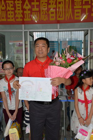 在捐贈儀式上,洪江游先生代表康芝紅臉蛋基金向軍屯小學贈送“愛心共建學?!迸曝?,并為孩子們發放愛心大禮包。孩子們則向洪董事長獻上了鮮花和自己精心繪畫的美術作品。