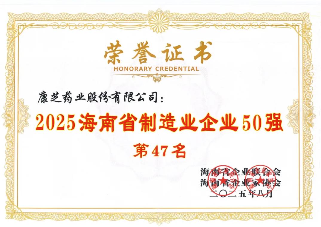 本次康芝藥業(yè)榮登“2025海南制造業(yè)企業(yè)50強(qiáng)”榜單,不僅是社會(huì)各界對(duì)公司綜合實(shí)力的認(rèn)可,更是對(duì)公司未來(lái)發(fā)展的激勵(lì)和鞭策。