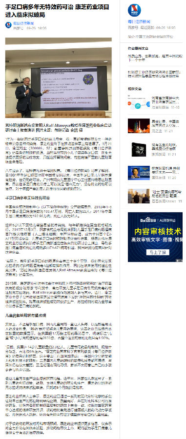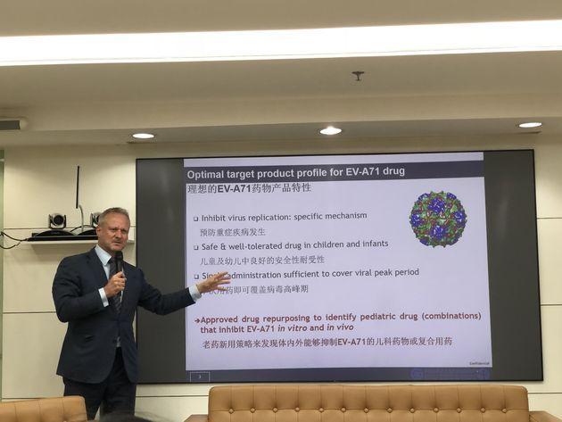 2015年,康芝藥業(yè)引進中法合作中科院上海巴斯德研究所的“治療病毒疾病的成分和方法”專利技術,著力研發(fā)兒童手足口病專用抗病毒藥物注射用蘇拉明鈉,Ralf Altmeyer教授作為發(fā)明人參與其中。近日,康芝藥業(yè)全資子公司收到國家藥品監(jiān)督管理局下發(fā)的“注射用蘇拉明鈉”藥物臨床試驗批件。如果臨床試驗成功并獲許生產,蘇拉明鈉將成為全球首個治療手足口病的新藥。