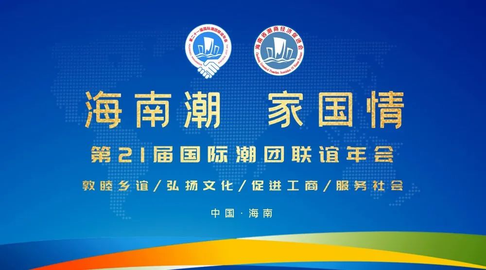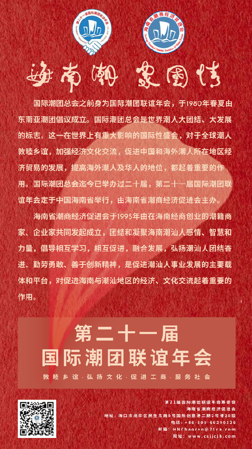 第21屆國際潮團聯誼年會將于12月3日至12月5日在博鰲亞洲論壇國際會議中心召開,本屆年會也是繼汕頭、北京、廣州、武漢之后第五次在中國內地召開、首次在海南召開。